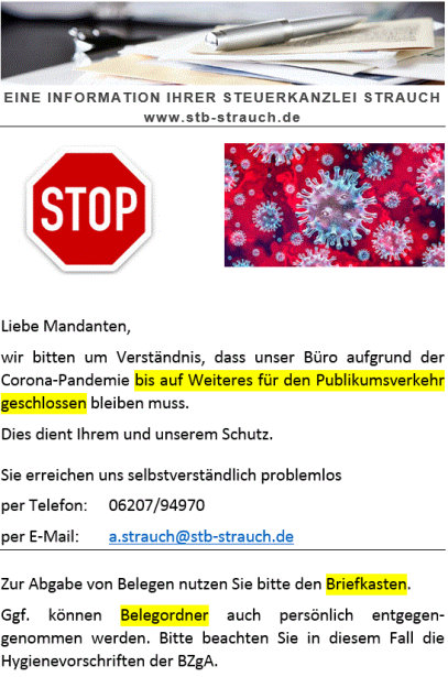 Aufgrund der Corona-Pandemie ist das Büro für den Publikumsverkehr bis auf weiteres geschlossen.